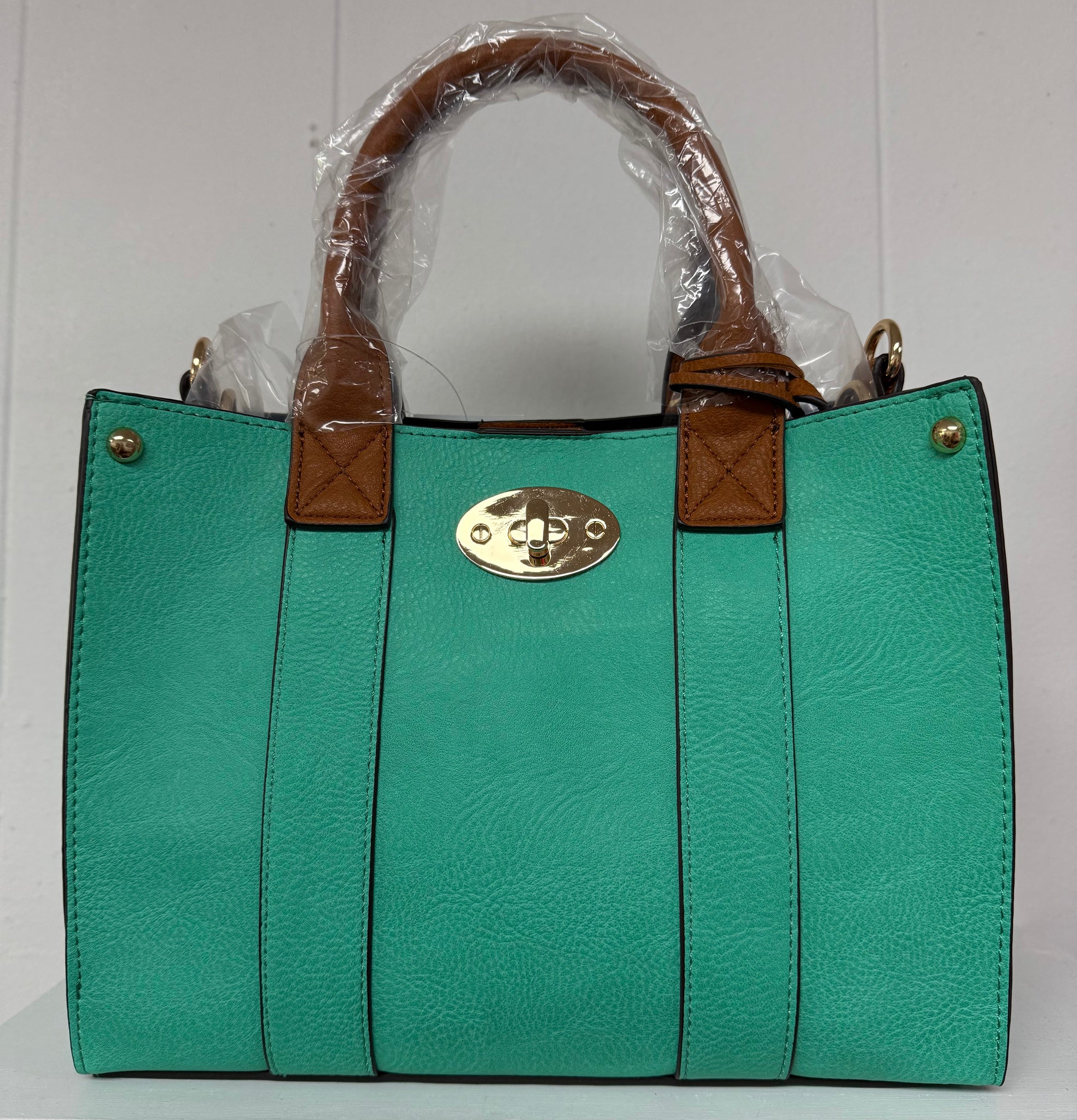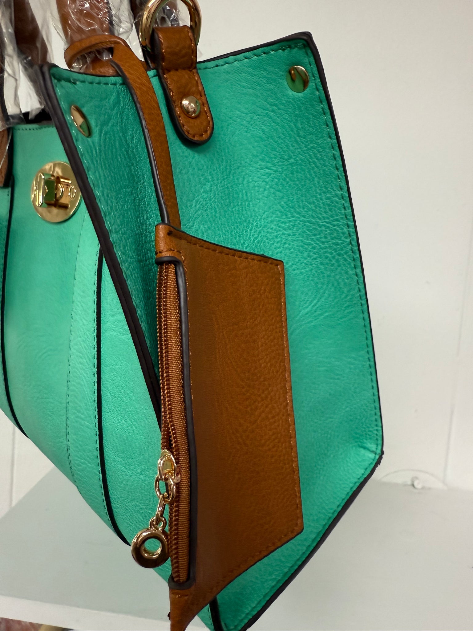 Beautiful vibrant purse that can be used in 3 different ways. Comes in turquoise or pink. Handle is made onto the purse. Also comes with an adjustable strap that can be used with the bigger purse or alone with inner purse. Or purses can be used together.